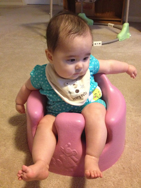 喝飽以後繼續睡, 下一攤我們九點才起床, 十點半多讓她小睡, 結果她只睡一小時就醒來哭, (只夠時間做嬰兒調理食物跟我自己的午餐就剛剛好做完而已) 後來幫她換衣服, 讓她坐下準備吃食物泥。