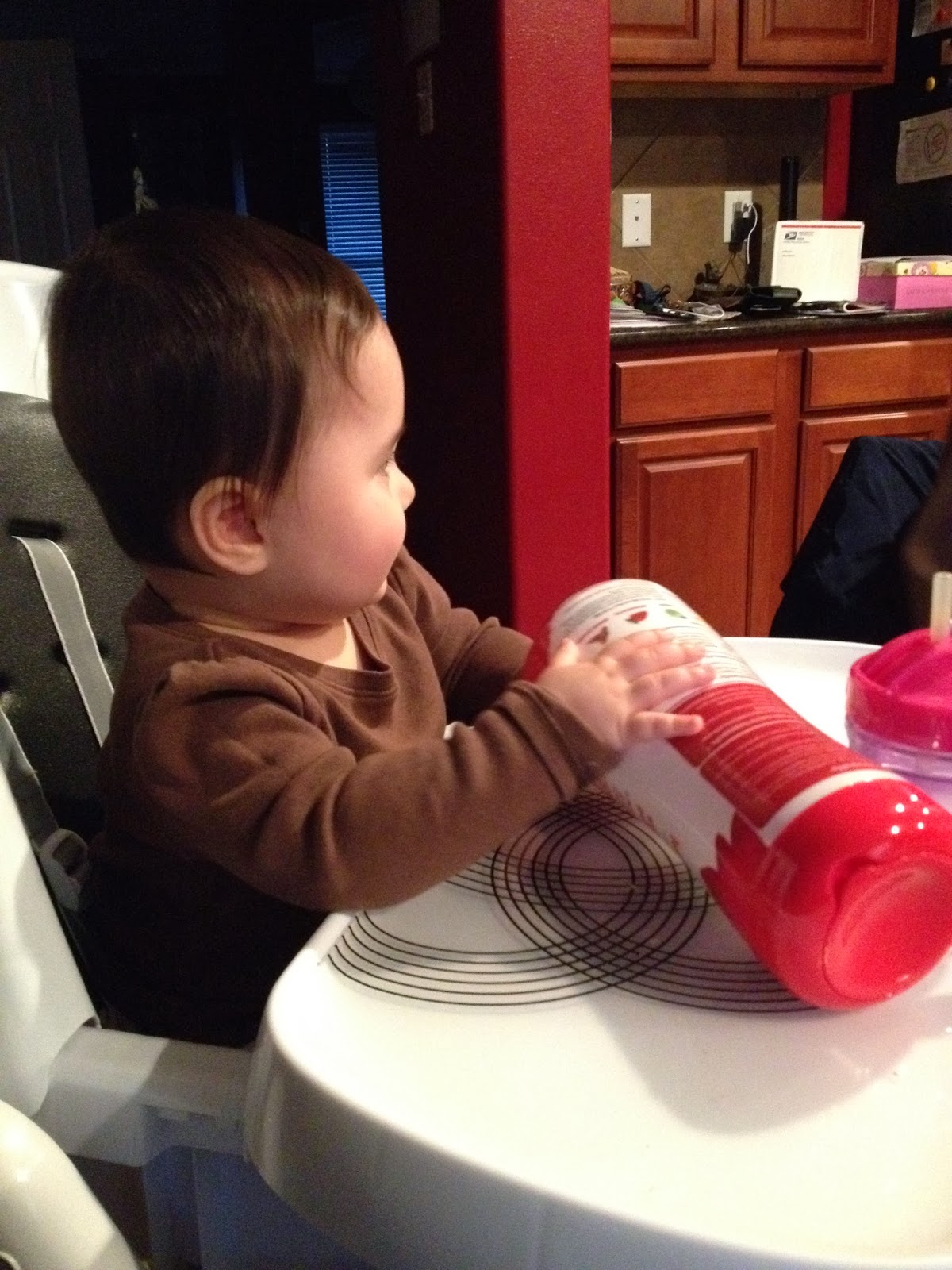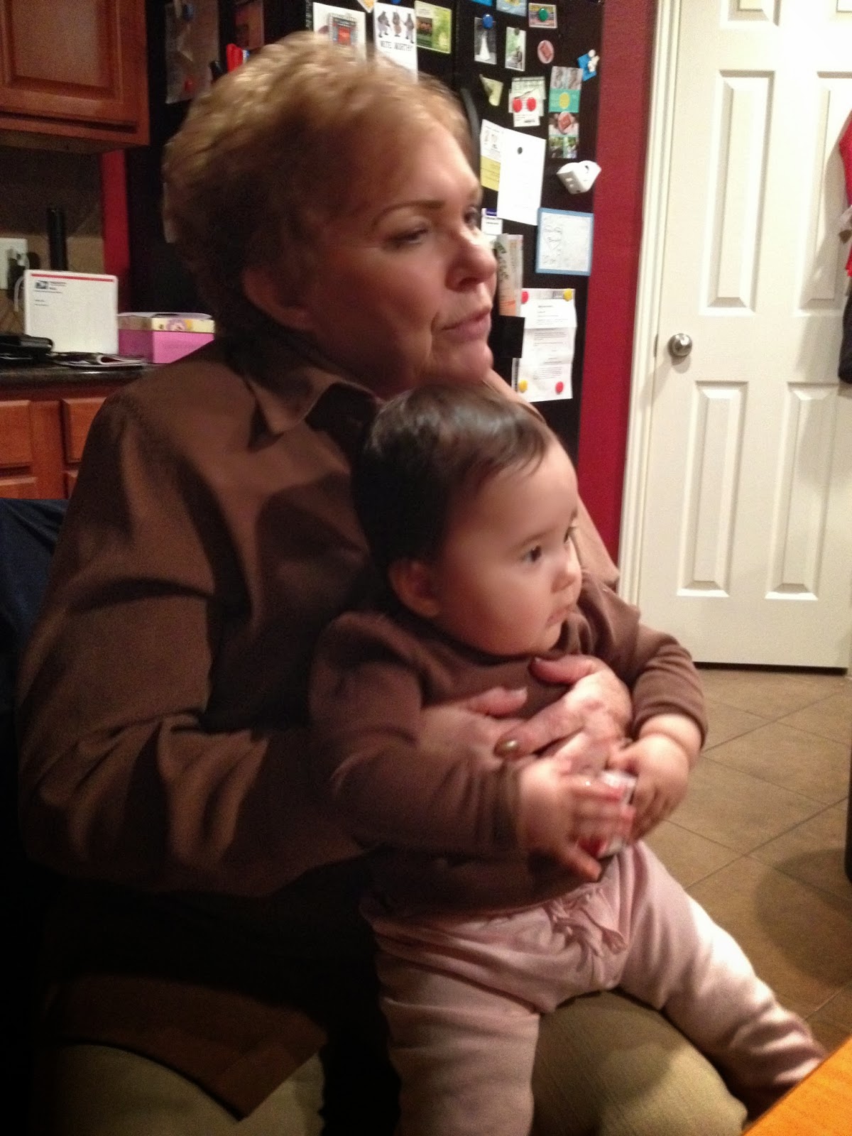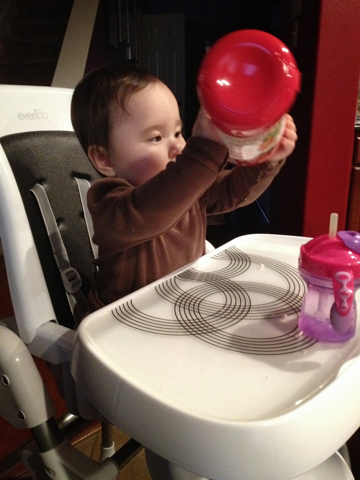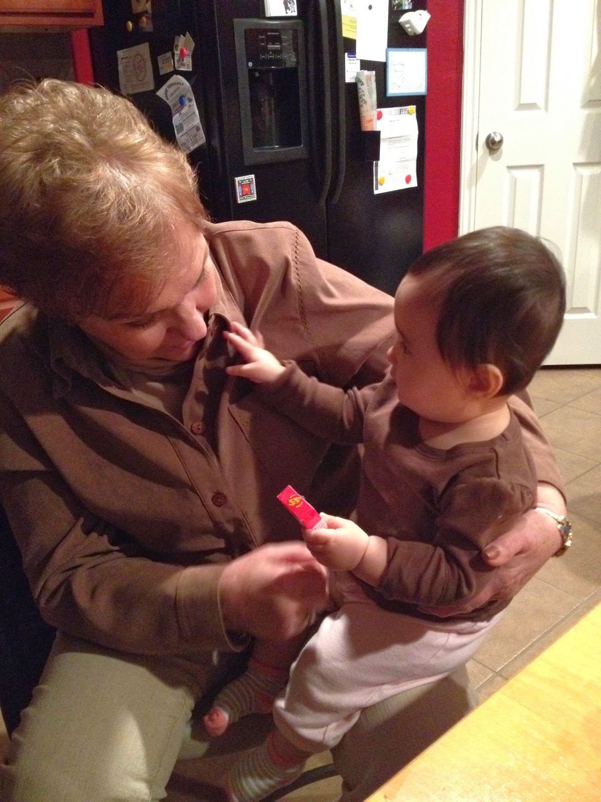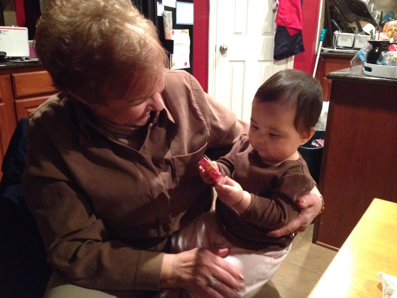 我負責餵嬰兒, 嬰兒吃飽飯, 拿著米果的盒子跟奶奶練舉上舉下