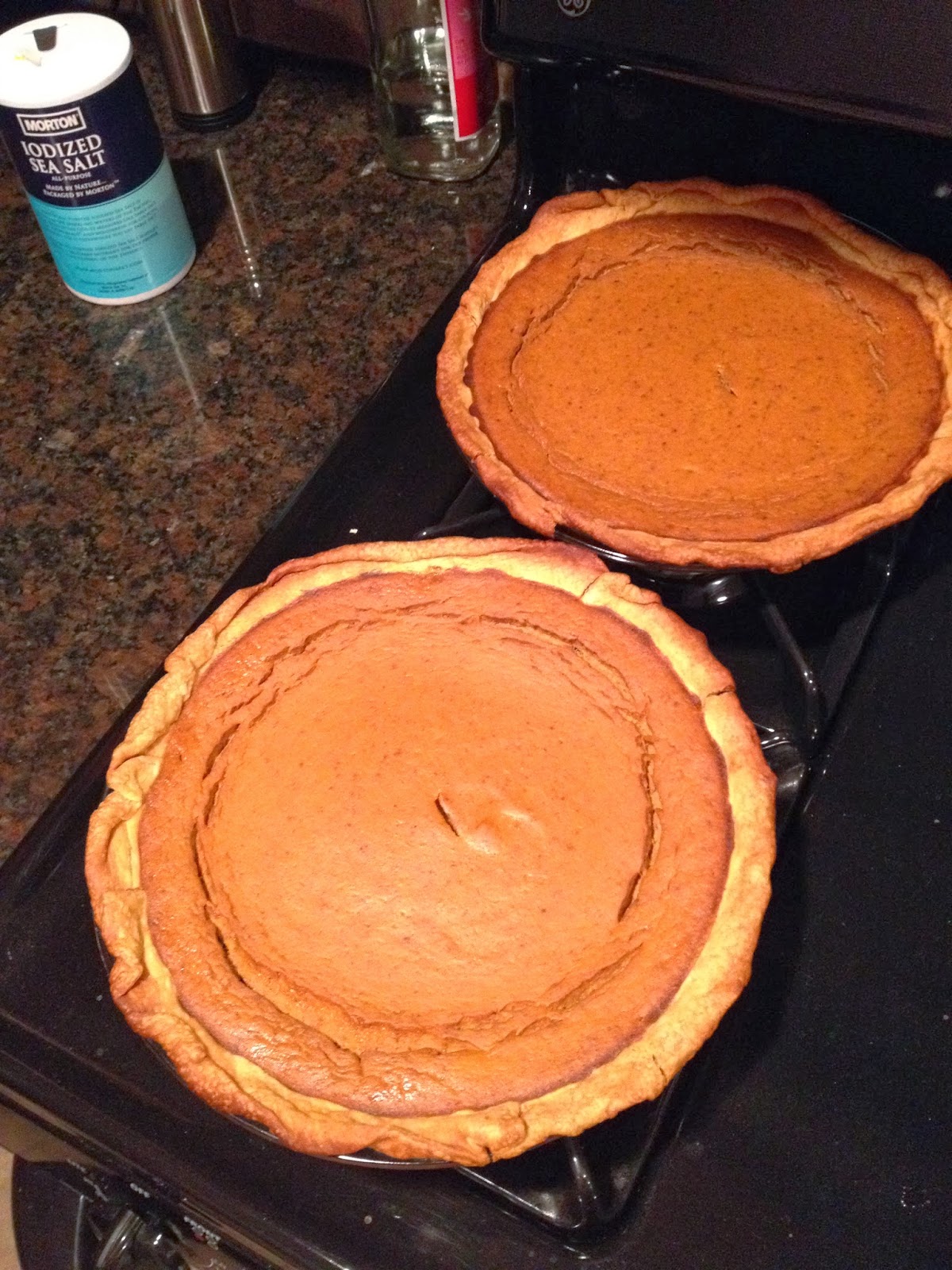 昨天晚上我們已經烤了餅乾, 小的蘋果派, 還有大的蘋果派。回到家, 大熊已經在做南瓜派, 通常做好後要室溫放涼兩小時, 然後放進冰箱隔夜才吃, 不過我已經先吃一塊了。(因為我覺得明天應該會飽到不行, 吃不下甜點, 今天先吃起來放著...)