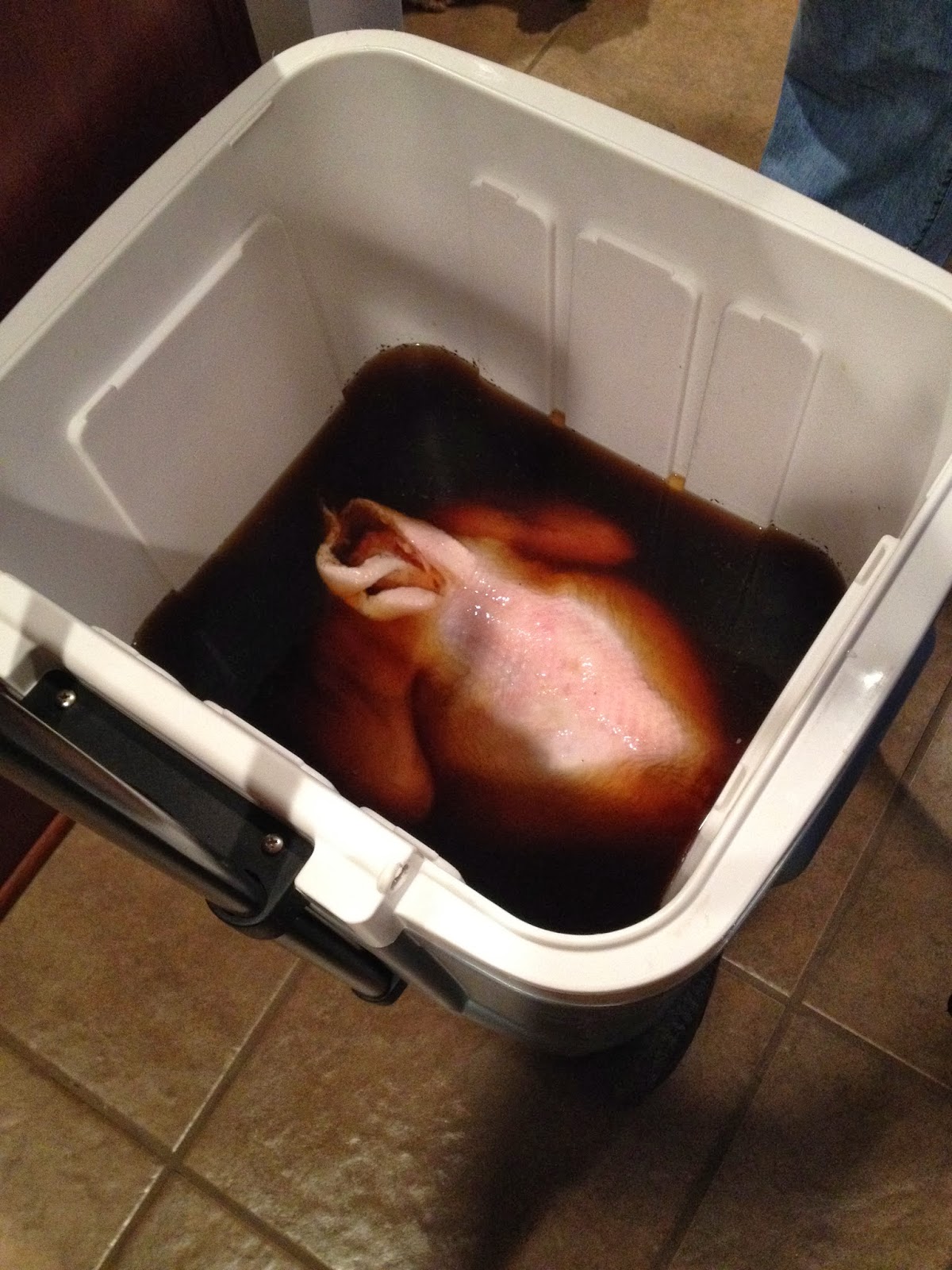 等醬料冷卻了, 再把剩下的3/4的水加進去, 然後把火雞清理乾淨放進洗好的cooler裡頭醃