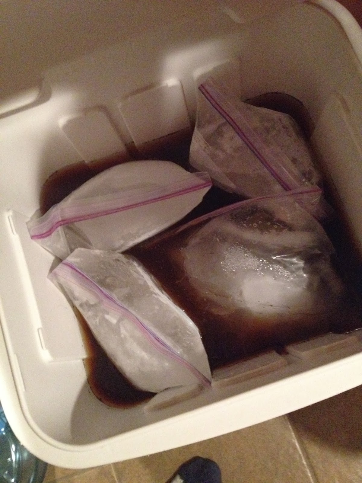 因為要保持溫度夠低, 才不會病菌快速繁殖, 放進預先準備好四加崙的冰塊, 這樣也可以讓火雞不會浮在水面上, 部分沒醃到