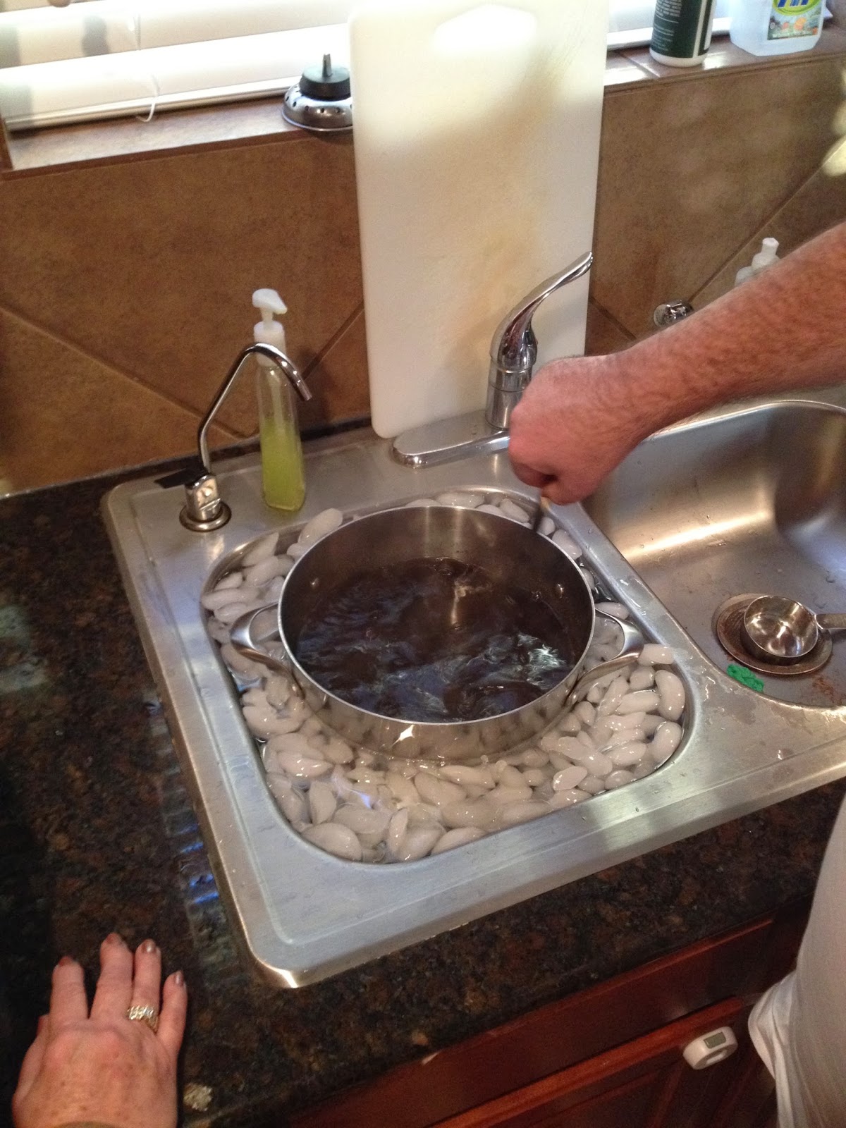 接著大熊做準備醃火雞的醬料, 大熊很精準的用量杯量好1/4的醬料, 包括一瓶醬油, 一堆香料, 用水煮沸後, 用冰塊快速冷卻