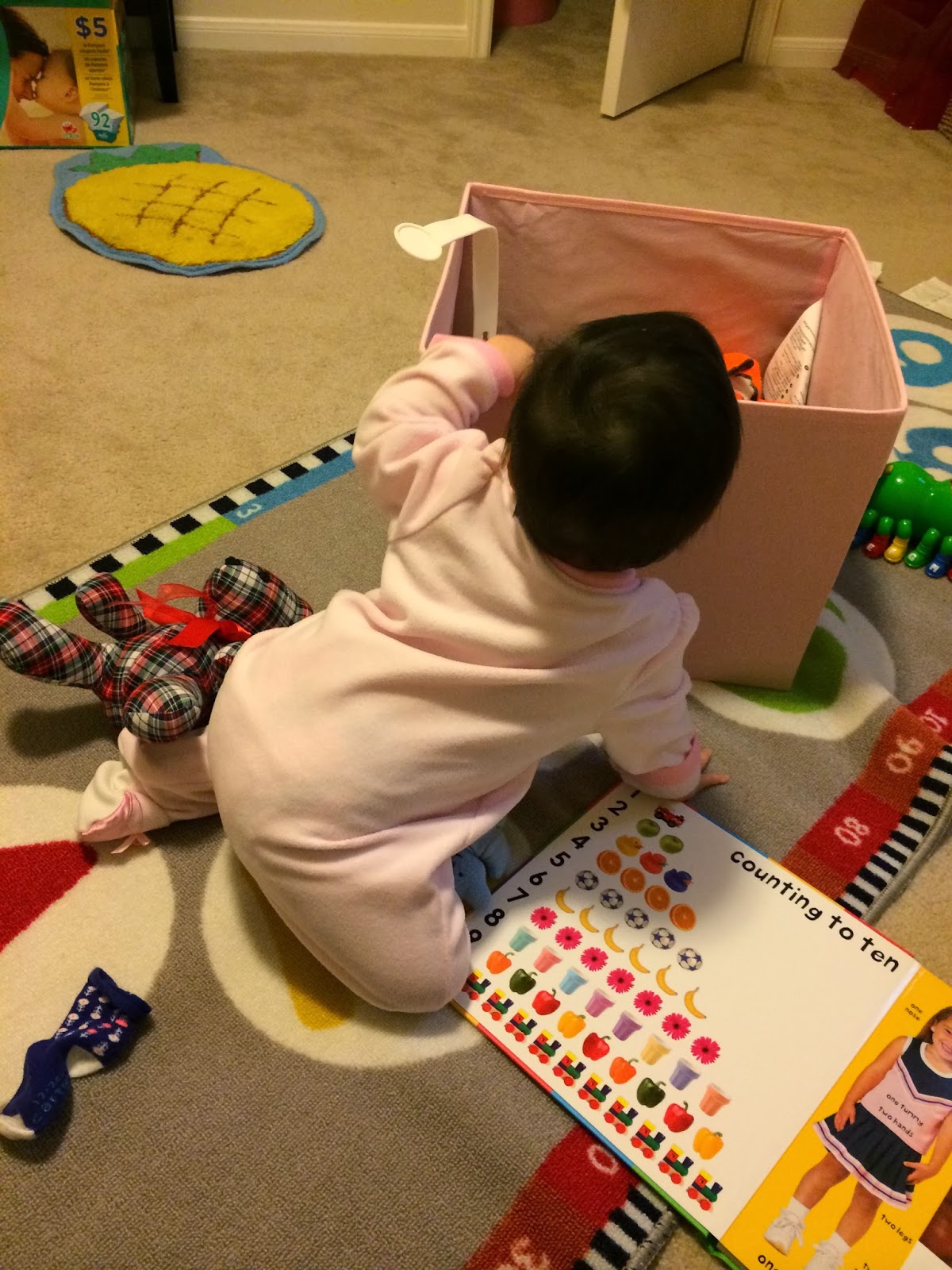 有聽說有些媽媽會把一籃一籃的玩具分開, 每天玩不同籃, 才不會每天都玩一樣的才玩膩, 看起來我可能要這樣做才行。