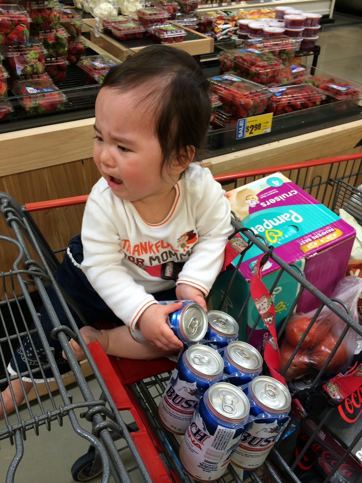 買菜的時候喜歡搶著拿東西, 搶紙條, 今天則因為拿不起其中一罐瓶子, 在超市哀哀叫...