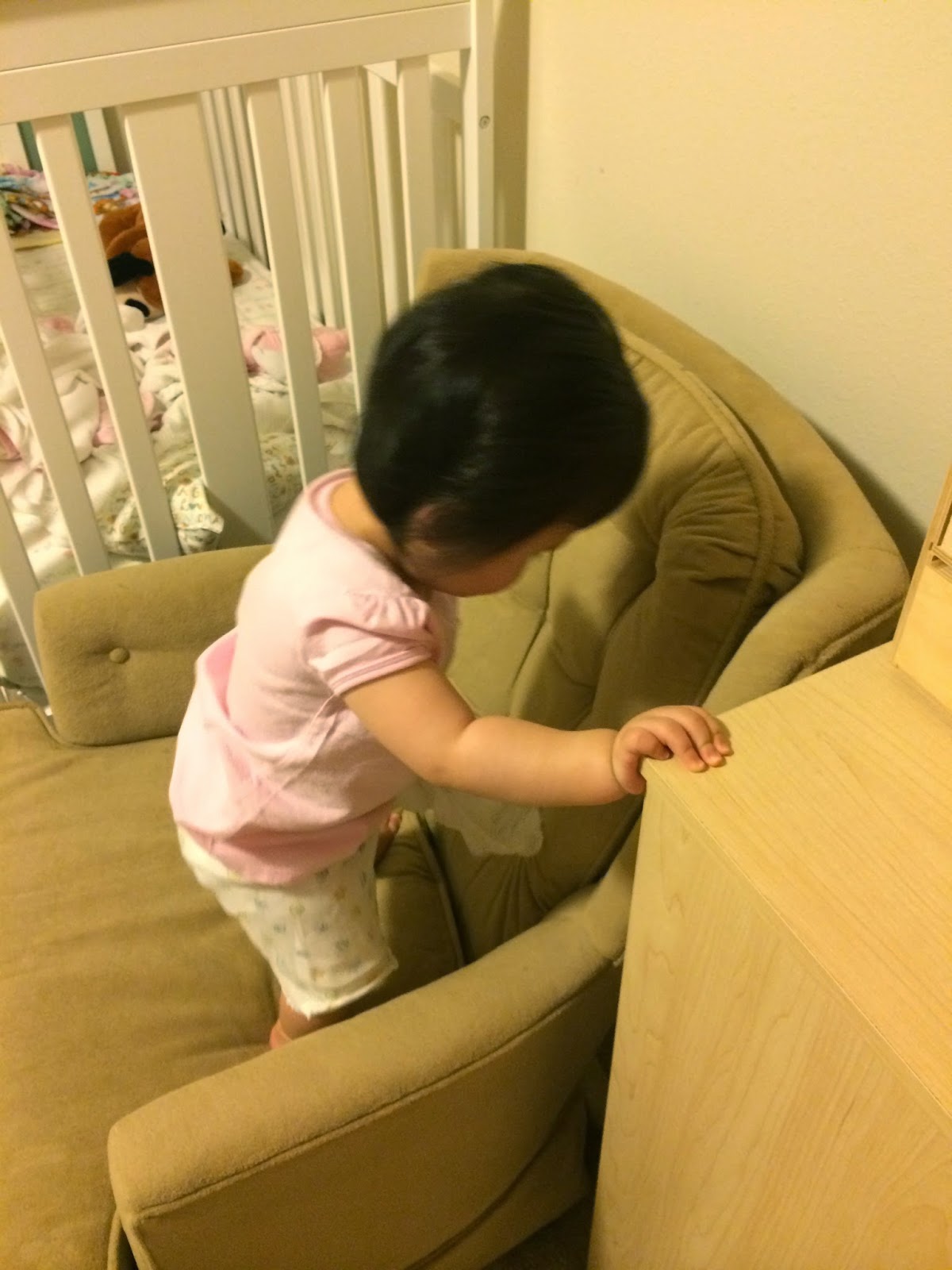 才幾步離開, 老母只是去丟個尿布, 回來阿秋就已經爬到搖椅上, 把手帕拿起來自己擦擦鼻子。